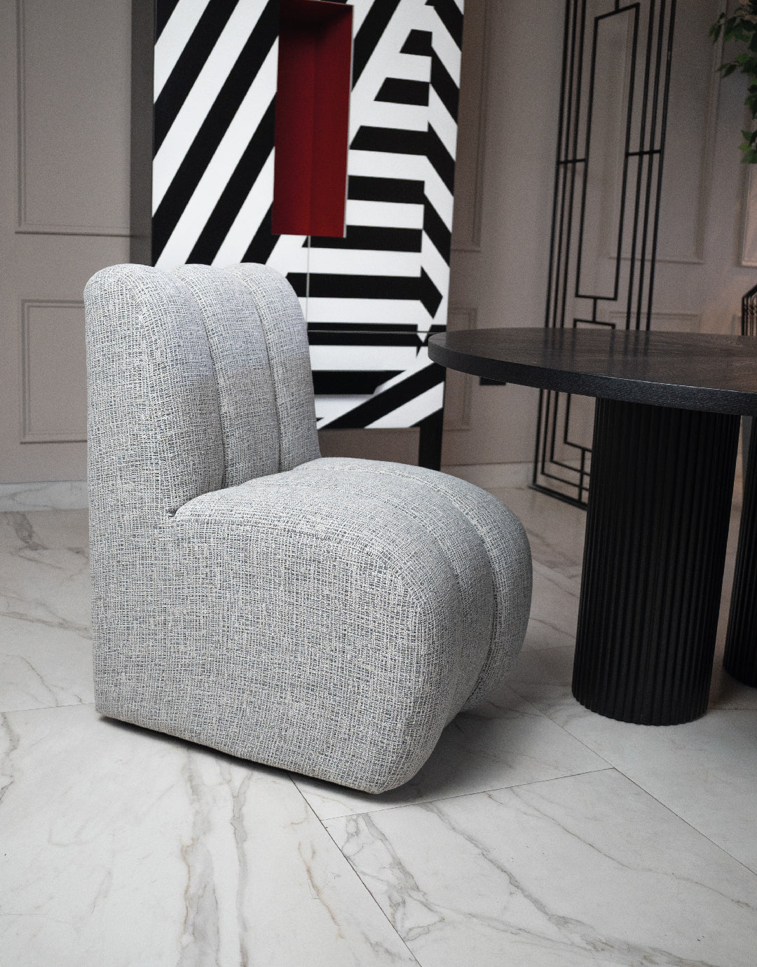 Su diseño moderno con líneas acolchonadas y volúmenes generosos la convierte en una pieza única y llamativa. Tapizada en tono claro con textura suave, brinda un estilo contemporáneo y acogedor, ideal para salas, lounges o espacios de descanso que buscan comodidad sin perder sofisticación.