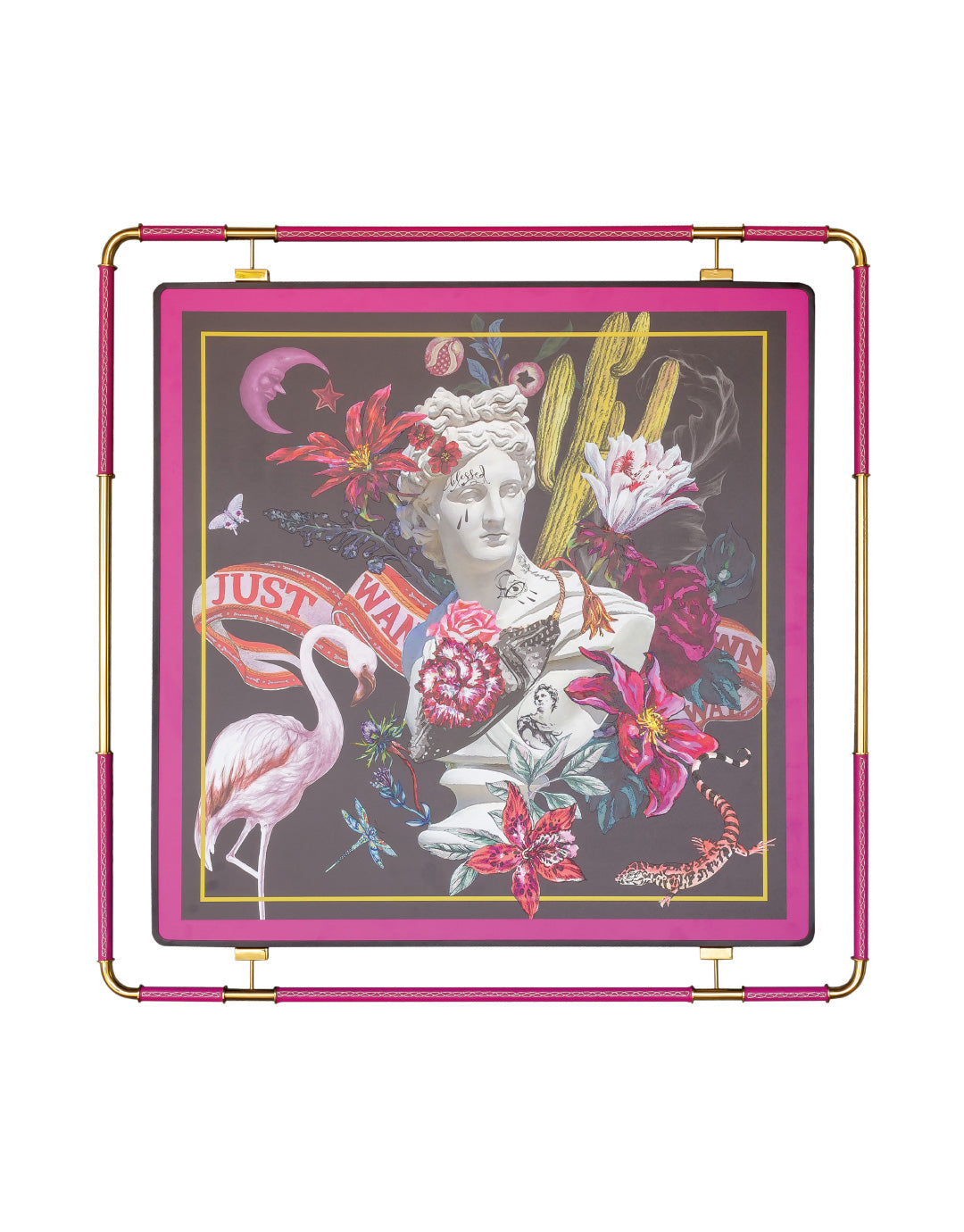 Obra de arte enmarcada con un diseño elegante de metal dorado y negro. La ilustración es una composición arquitectónica con elementos clásicos y surrealistas en tonos verdes, azules y dorados. Destacan figuras escultóricas, detalles ornamentales y una estructura simétrica con un ojo central como punto focal.