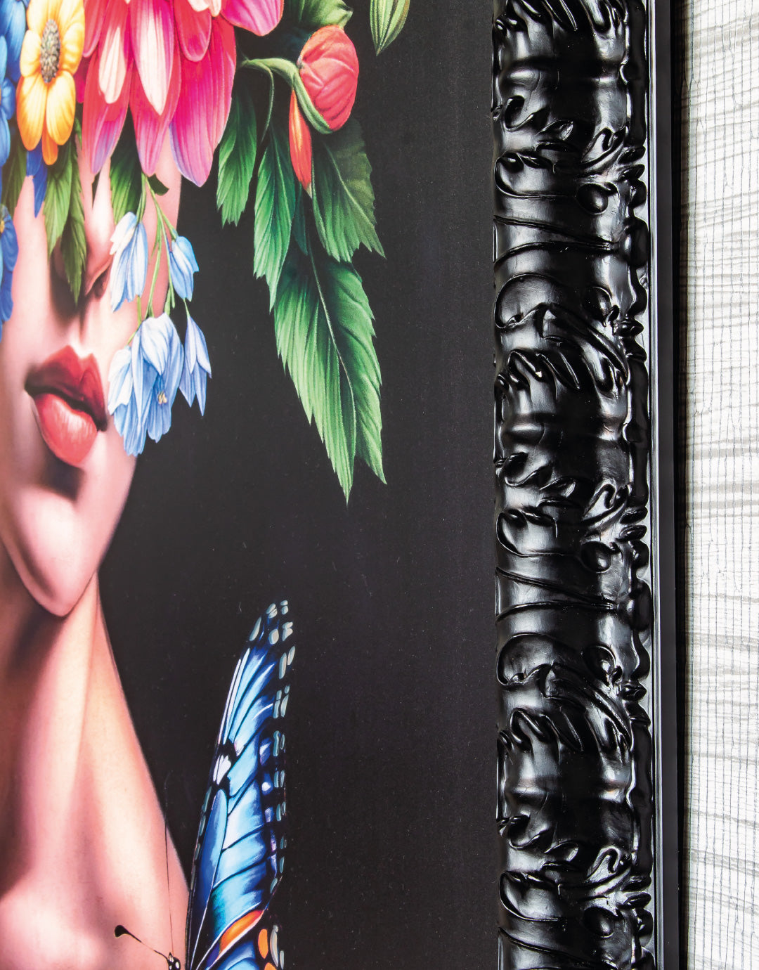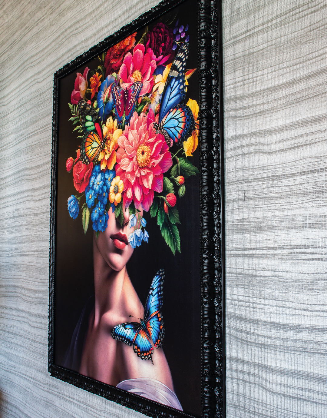 Una representación etérea y elegante de una mujer cuyo rostro se fusiona con un vibrante arreglo floral. Mariposas de colores revolotean entre las flores, aportando un toque de delicadeza y movimiento. La combinación de tonos intensos sobre un fondo oscuro resalta la luminosidad de la composición, evocando una sensación de misterio y feminidad. Ideal para espacios que buscan una pieza sofisticada y onírica.