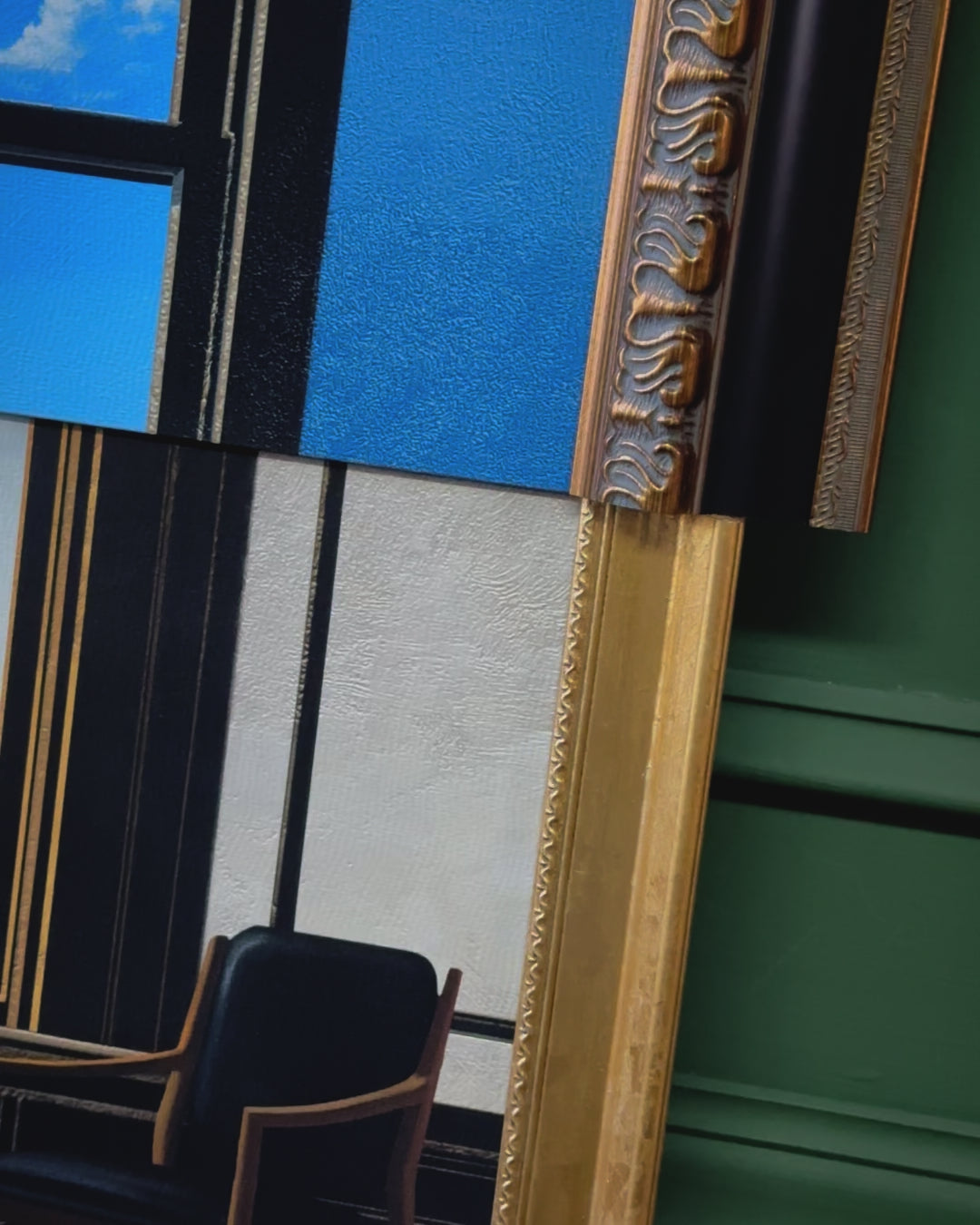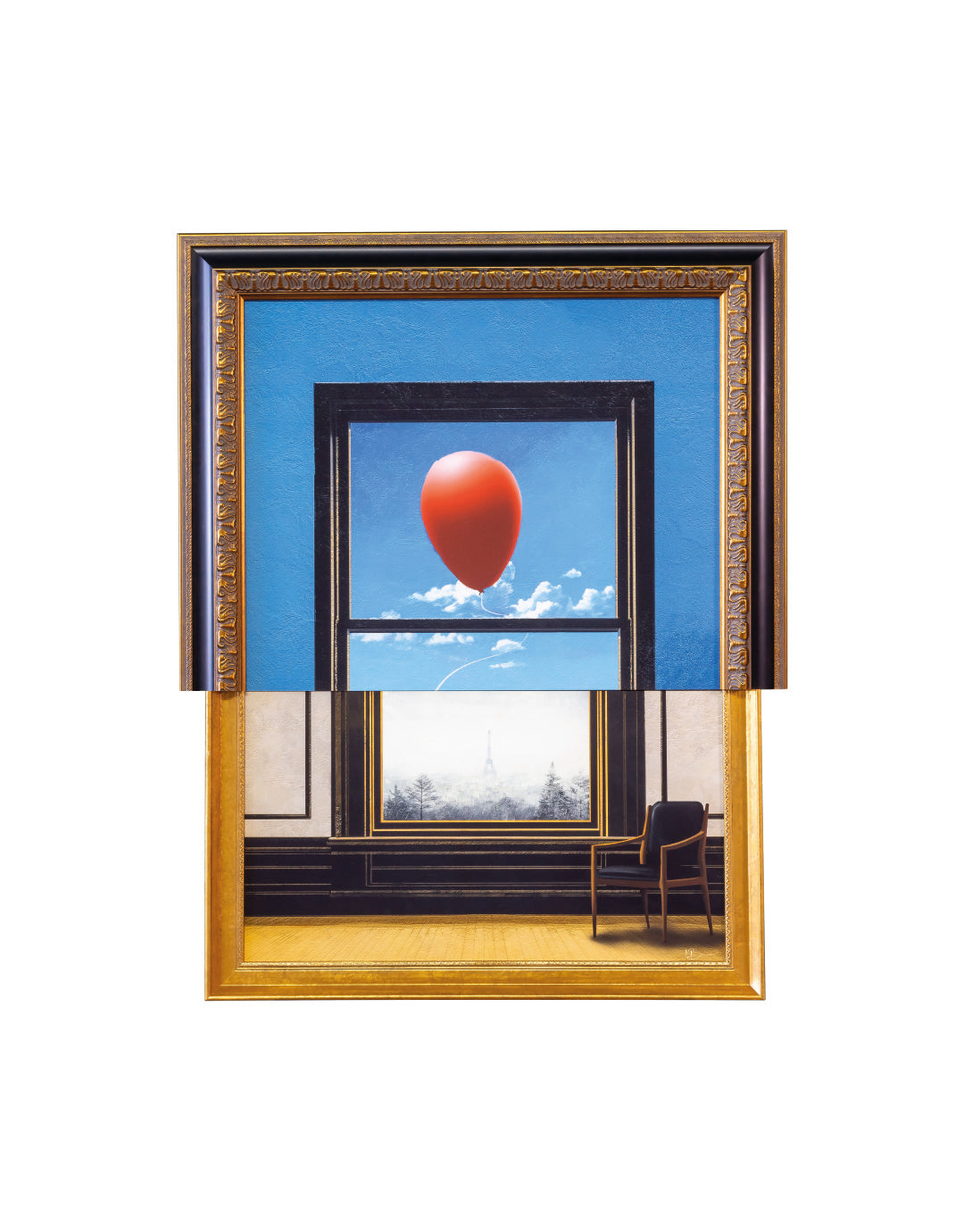 Una obra intrigante que juega con la percepción visual y la narrativa espacial. “What a Beautiful Day” presenta dos escenas enmarcadas en un solo cuadro: un globo rojo flotando frente a un cielo azul vibrante y, debajo, una habitación con vista a una París neblinosa dominada por la Torre Eiffel. El uso de marcos superpuestos y perspectivas crea un efecto de profundidad y surrealismo.