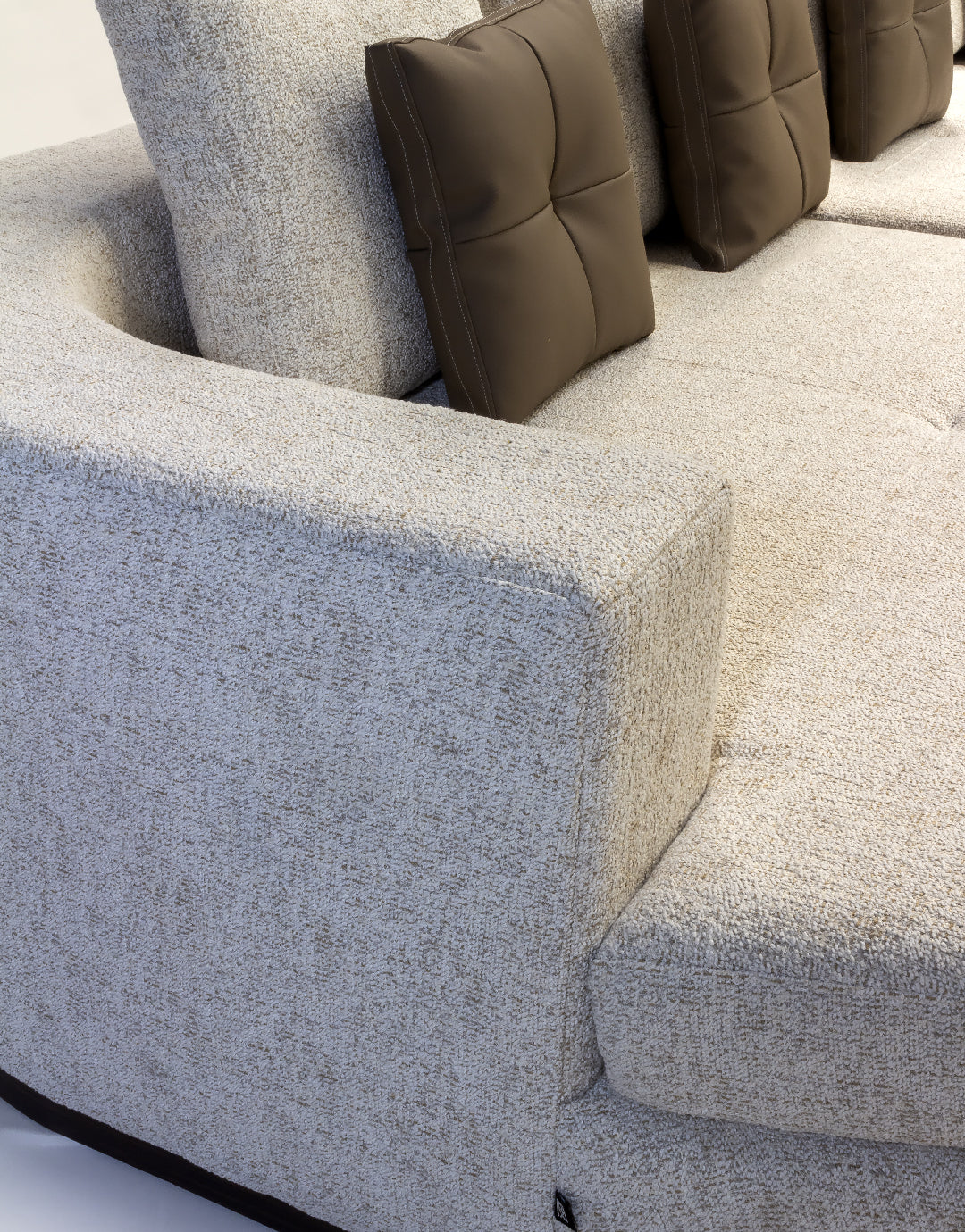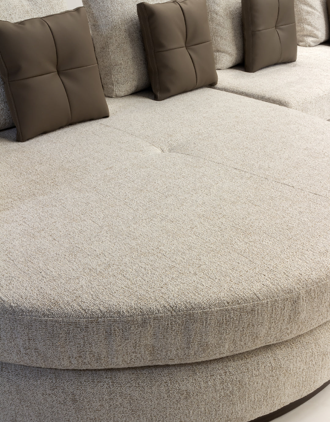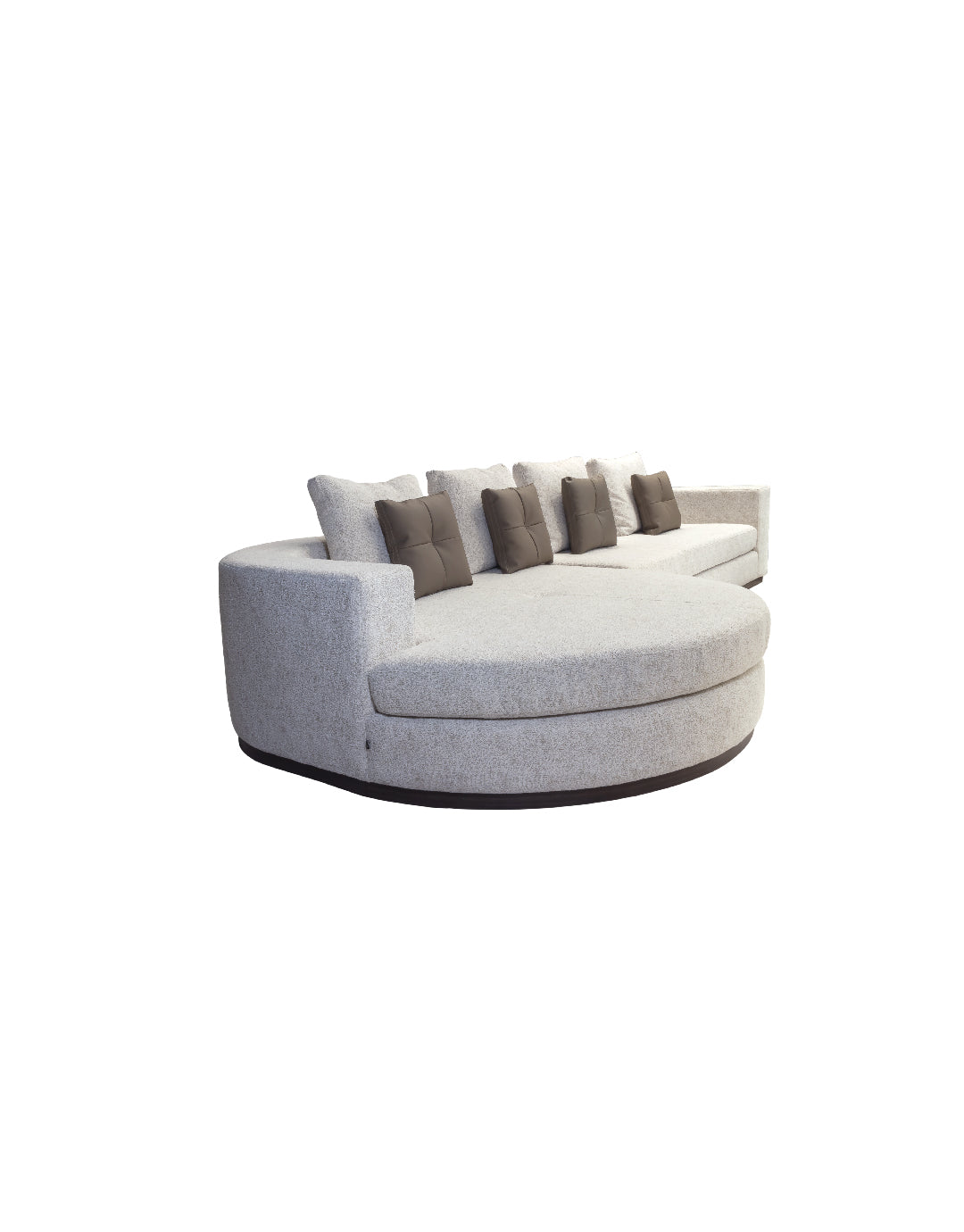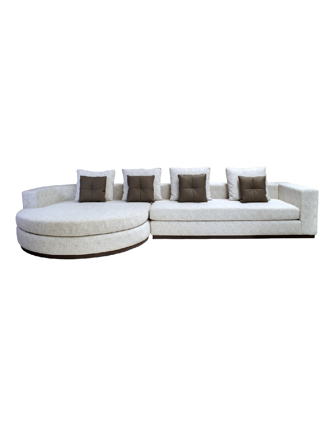 Este sofá seccional destaca por su diseño contemporáneo y funcionalidad. Con líneas limpias y una paleta de colores neutros, combina comodidad y elegancia. Su distintivo módulo circular agrega un toque innovador, perfecto para un ambiente moderno y sofisticado.